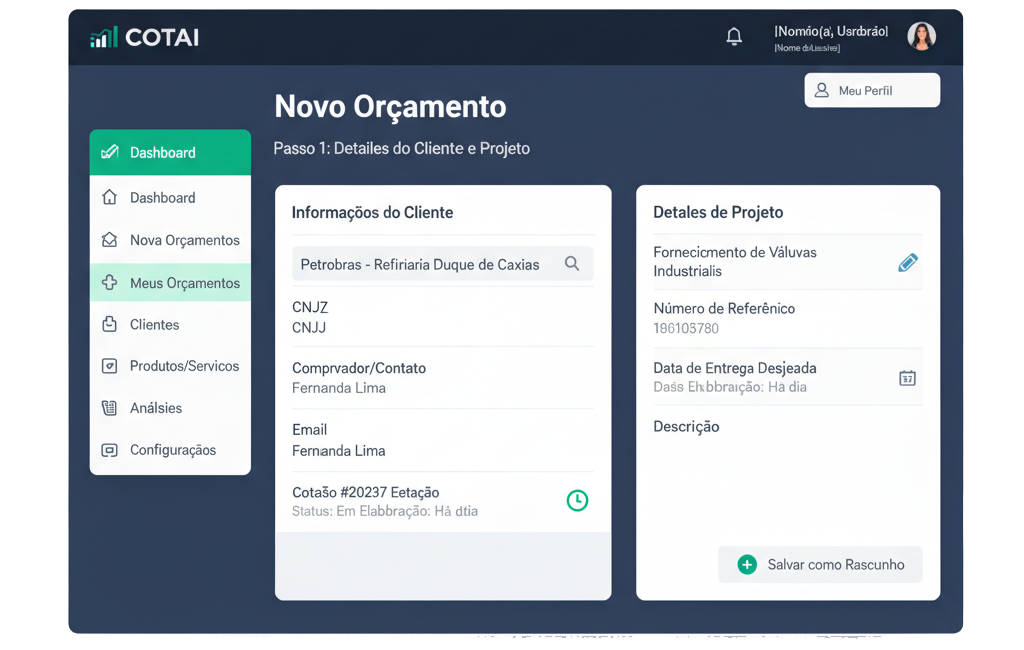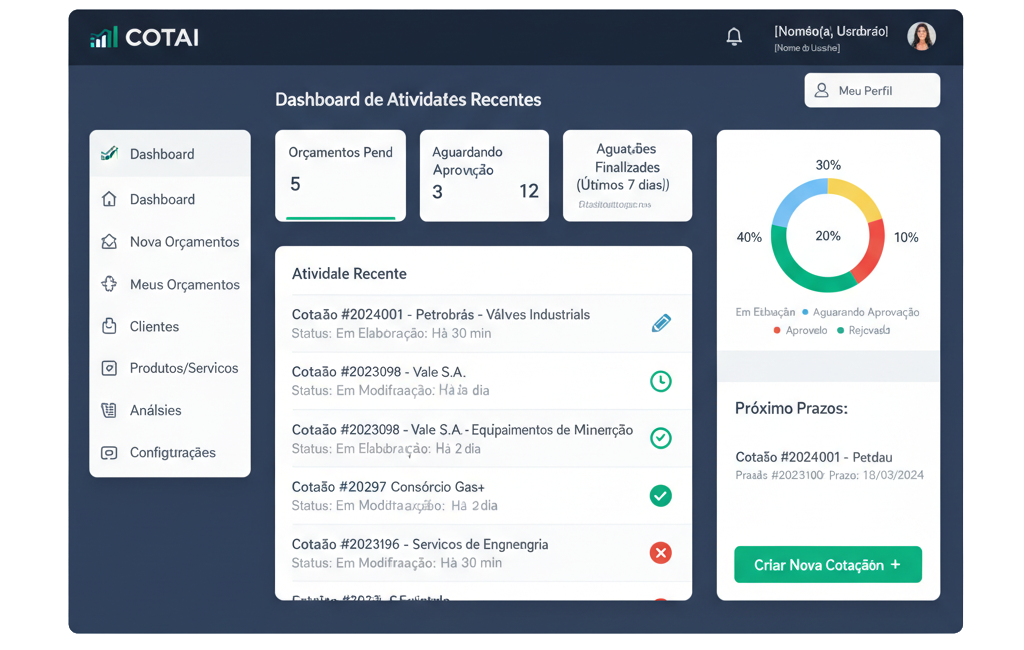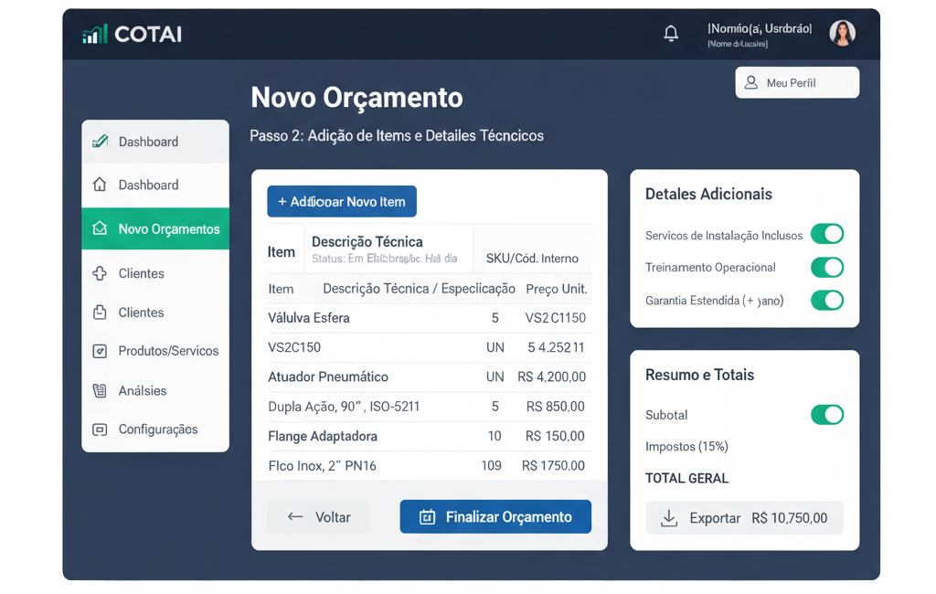 O CotAI é o primeiro assistente de IA especializado em criar orçamentos comerciais inteligentes. Ele analisa estoque, perfil do cliente e histórico de vendas para gerar cotações precisas e personalizadas em segundos, com sugestões automáticas de upsell e substituições. Ideal para equipes de vendas, representantes comerciais e empresas que buscam agilidade, redução de erros e aumento na taxa de conversão de propostas.
